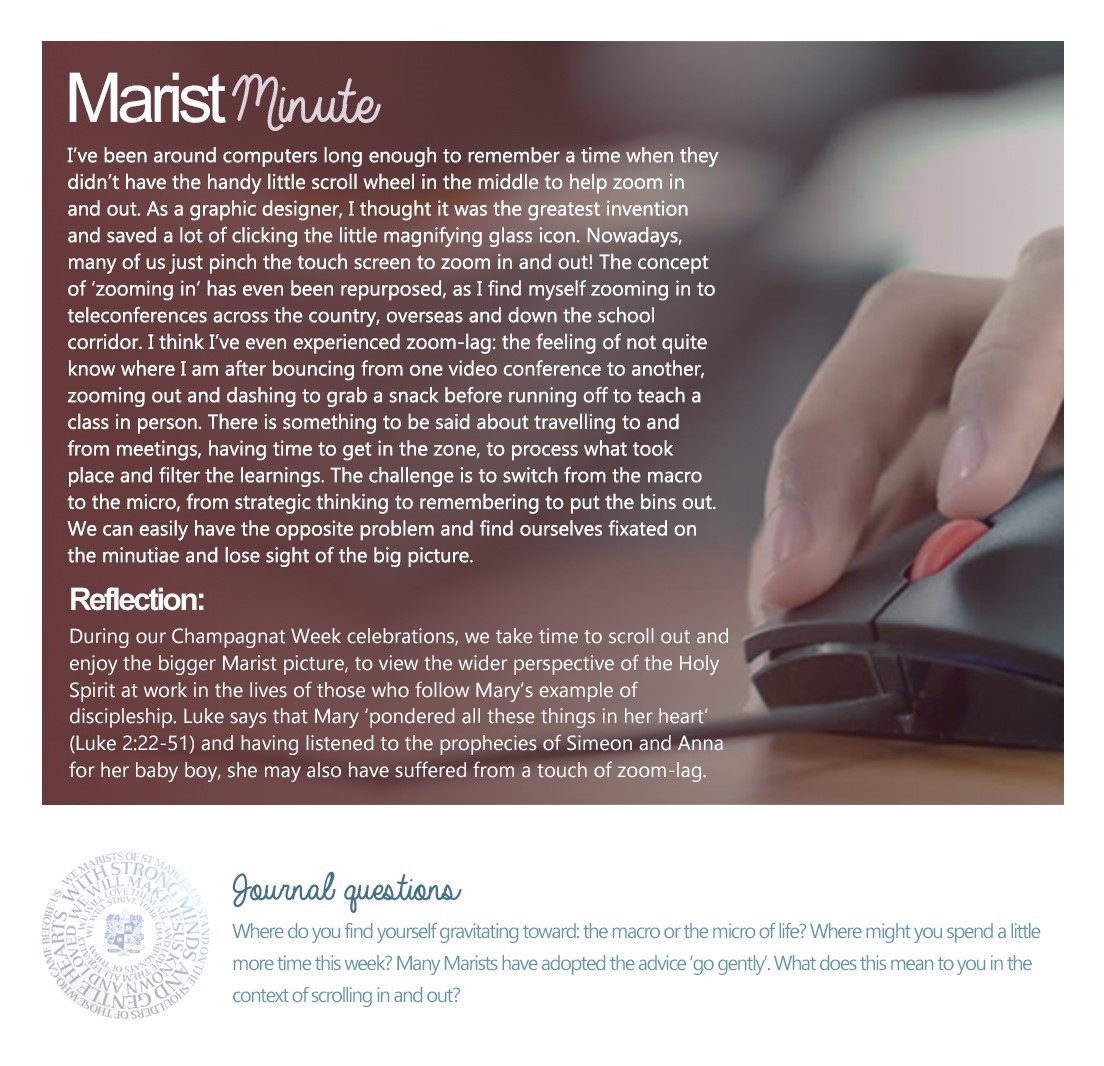 Marcellin was a person of restlessness who found peace in God. Pope Francis encourages us to have a healthy restlessness. He believes the greatest danger we face is the temptation to mediocrity - preferring to stay immobile, to remain indifferent and passive. He calls it the ‘sofa of comfort and convenience.’ It has been interesting to witness the worldwide demonstrations following the brutal death of George Floyd at the hands (knee) of policemen. People as advocates, challenging embedded racism, demanding change and being a person of service is what Marcellin would hope from graduates of a Marist school.