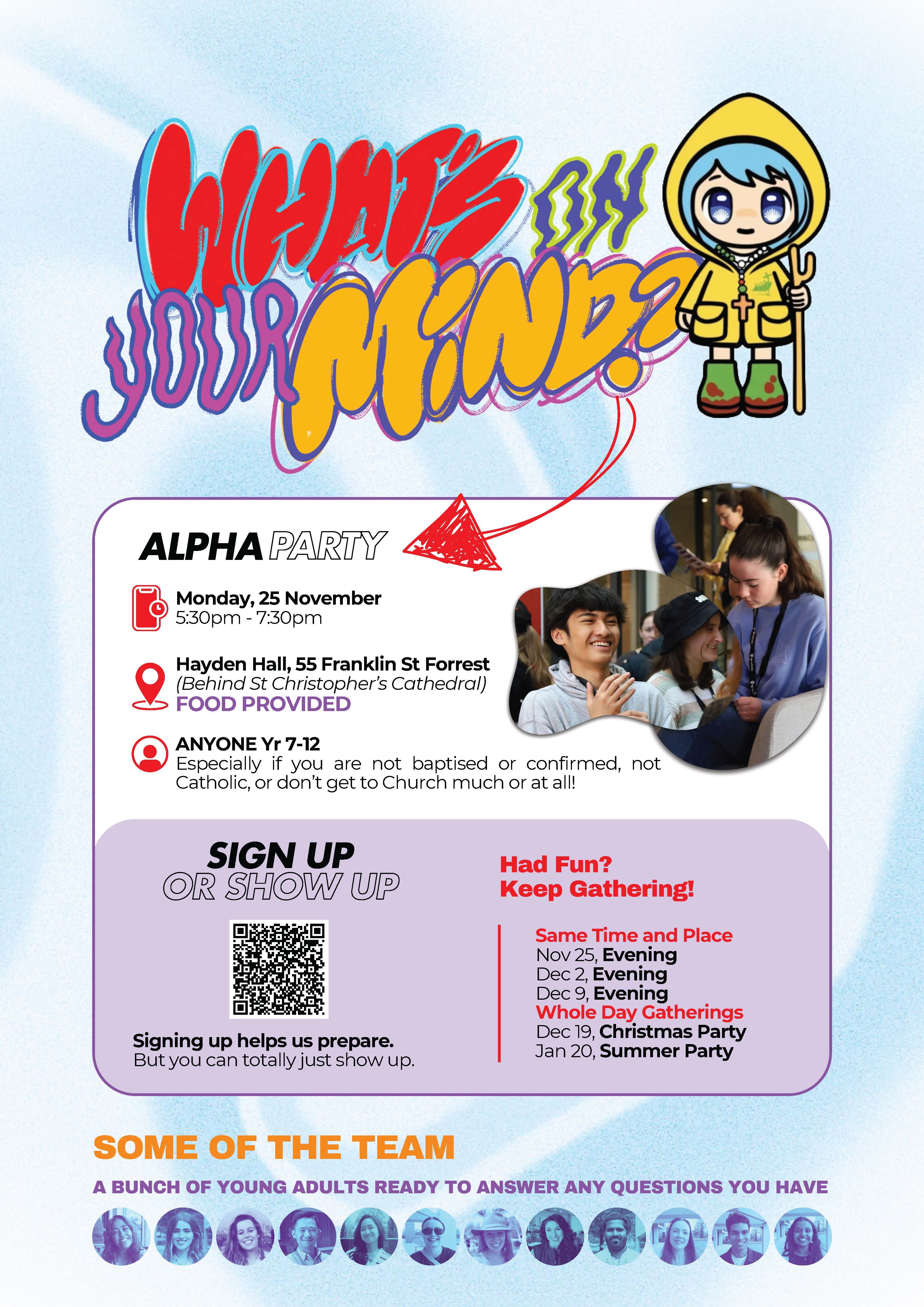 Students in Year 7-12 are invited to the first session of a Youth Alpha program on Monday 25 November from 5.30pm - 7.30pm at Hayden Hall, 55 Franklin St Forrest (Behind St Christopher’s Cathedral). The program is presented by young adults and is offers a conversation about life, faith and purpose. The Archdiocesan Youth Office is inviting young people who are not baptised or confirmed, not Catholic, or don’t get to Church much or at all. Food will be provided.